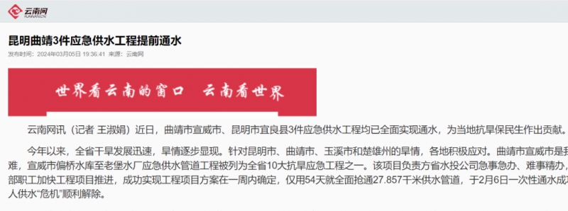 媒体聚焦 | 云南水利报道:民生至上 全力保供 昆明曲靖3件应急供水工程提前通水